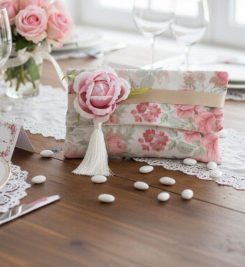 Raffinata pochette in chiffon fiorato impreziosita da una rosa con pennacchio bianco laterale. Elegante e versatile, è ideale come bomboniera, porta confetti o piccolo dono per cerimonie. Dimensioni 19 × 11 cm.